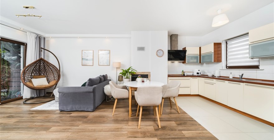 Apartament o powierzchni użytkowej 112,94 m2, z 2016 roku, gotowy do wejścia i wykończony w wysokim standardzie. Z salonu jest wejście na piękny, zadbany ogród. Z dwóch pokoi na pierwszym piętrze jest wyjście na duży balkon. Wyjście na balkon oraz ogród jest od strony południowej. Okna drewniane nowego typu. Dach jest z blachy. Ogrzewanie i ciepła woda - piec gazowy dwufunkcyjny. Na podłodze w pokojach są panele, natomiast w przedpokoju, kuchni i łazienkach są płytki. Kuchnia jest wyposażona w: lodówkę, zmywarkę, płytę indukcyjną, piekarnik, okap i mikrofalówkę.