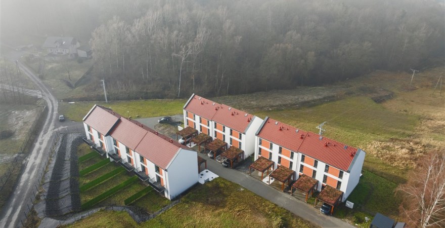 Prezentowana, kameralna inwestycja to nowe osiedle domów jednorodzinnych dwulokalowych z podziałem pionowym, urządzone w taki sposób, że każdy segment funkcjonalnie jest jak trzykondygnacyjny dom w zabudowie szeregowej. Osiedle wyróżnia się wysokim standardem i atrakcyjną lokalizacją - na obrzeżach miasta, w pobliżu lasu, a jednocześnie z dobrze rozwiniętą komunikacją. W odległości kilkuset metrów znajduje się przystanek autobusowy, sklep Lewiatan, stacja SKA oraz szkoła i przedszkola. Oferta jest doskonałą alternatywą dla mieszkania w bloku, przy jednoczesnej możliwości korzystania z infrastruktury miasta.