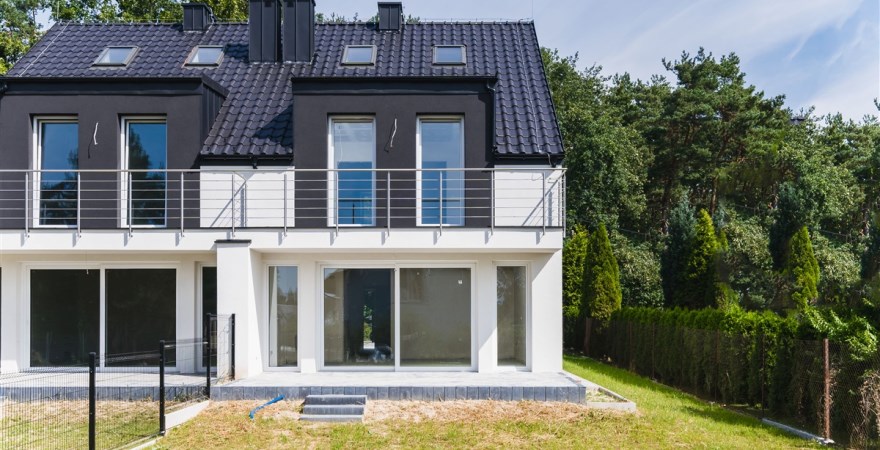 Dom w zabudowie bliźniaczej, z nowoczesnymi lukarnami, które urozmaicają prostą formę bryły budynku
