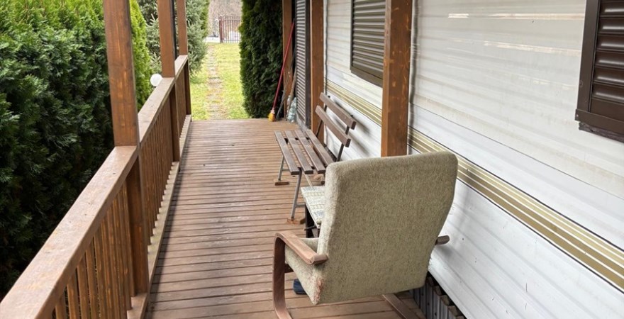 Część mieszkalna – duży domek holenderski (salon, kuchnia z mini jadalnią, sypialnia, dodatkowo mini sypialnia dla dzieci , łazienka. Domek zadaszony drewnianą wiatą z gankiem przez całą długość. W oknach rolety.