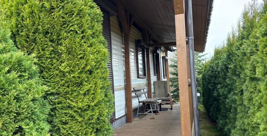 Część mieszkalna – duży domek holenderski (salon, kuchnia z mini jadalnią, sypialnia, dodatkowo mini sypialnia dla dzieci , łazienka. Domek zadaszony drewnianą wiatą z gankiem przez całą długość. W oknach rolety.