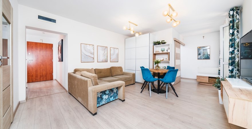 - przestronny salon z wydzieloną sypialnią i wyjściem na balkon