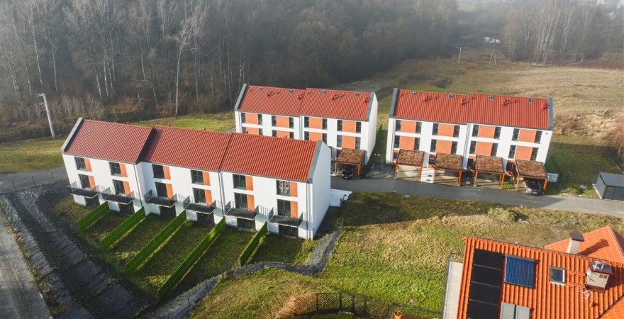 Nowe ogrodzone osiedle domów jednorodzinnych dwulokalowych z podziałem pionowym, urządzone w taki sposób, że każde mieszkanie funkcjonalnie jest jak trzykondygnacyjny dom w zabudowie szeregowej.