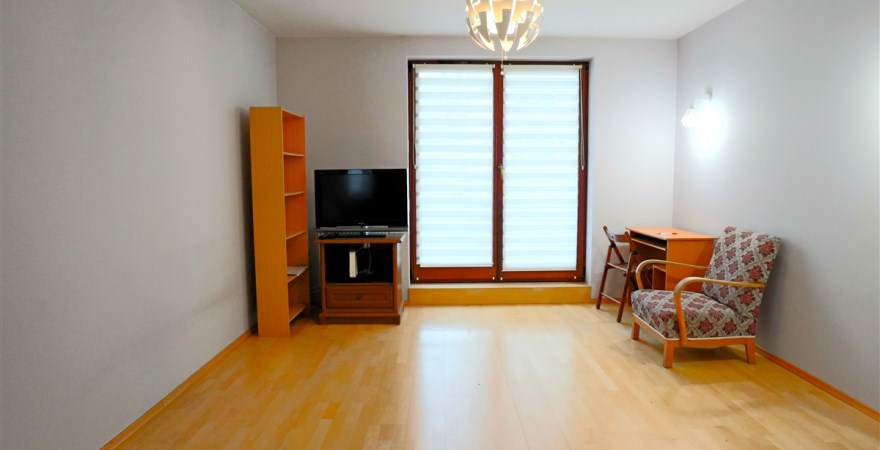 Lokal wyposażony w podstawowe meble i sprzęty. W części kuchennej lodówka, kuchenka elektryczna z piekarnikiem, okap, mikrofalówka, stół z krzesłami. W salonie m.in. biurko, regał, telewizor. W sypialni szafa i biurko. Łazienka z prysznicem, toaletą, bidetem i pralką. W przedpokoju praktyczne szafy.