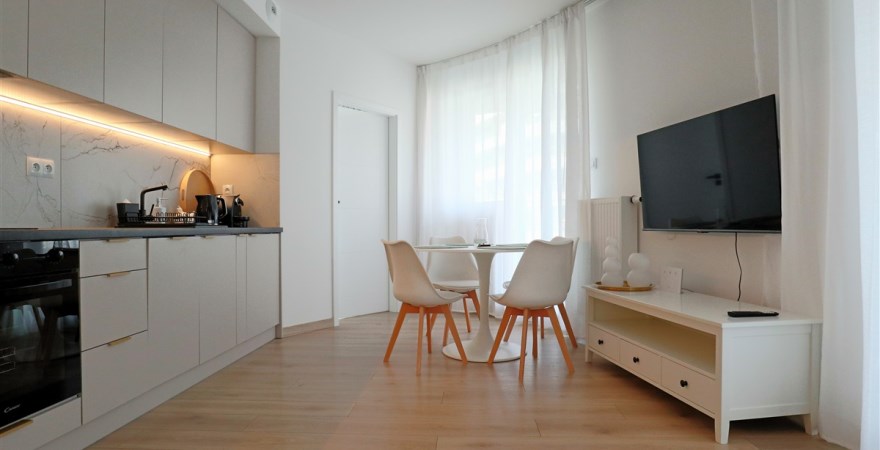 Mieszkanie w pełni umeblowane i wyposażone. W salonie sofa, stół z krzesłami, szafka rtv, telewizor. W części kuchennej płyta, piekarnik, zmywarka, lodówka. W sypialni podwójne łóżko i duża szafa w zabudowie. Łazienka z prysznicem, toaletą i umywalką. W przedpokoju szafa i szafka na buty.
